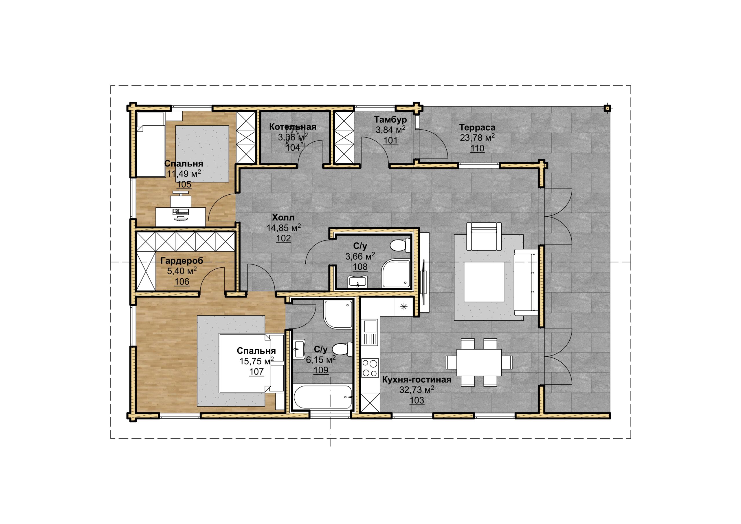 Bauern - это прекрасный одноэтажный дом, подходящий, как для городской, так и для сельской местности. Единая конструкция делает этот дом очень аккуратным и быстрым в сборке. Центральное место занимает гостиная площадью 32,73 кв. м.