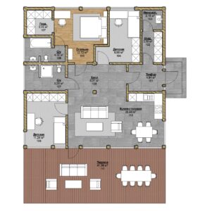Стены из клееного бруса толщиной 160мм (этого вполне достаточно, чтобы сохранить тепловой контур дома). Брус произведен из хвойных пород древесины.